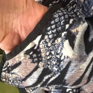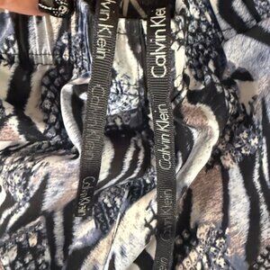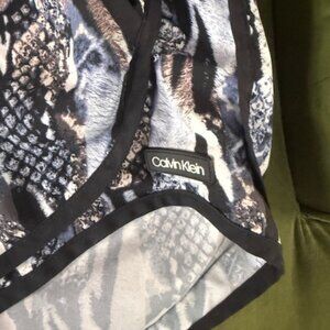 Preowned. Calvin Klein Brand Athletic Shorts. Has snake skin print through out with blues and blacks. Size XXL. Measures 18 inches across at waist and can stretch to 22 inches across. Has a workable draw string. Has pockets