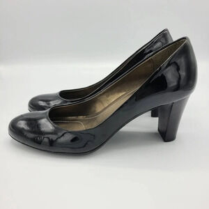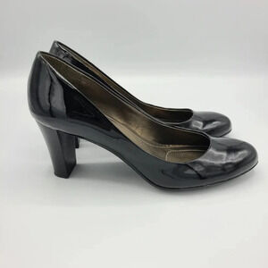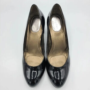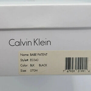 Calvin Klein Babe Black Patent Leather Heels Pumps Stacked Heel 7. Shiny black patent. Stacked block heel. Almond toe. Comfort, slip resistant sole. Heel height is 2 3/4" in. Comes in box. In very good preowned condition with no flaws or signs of wear.