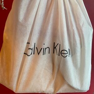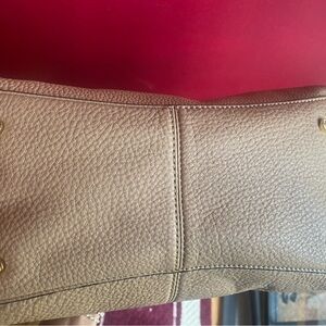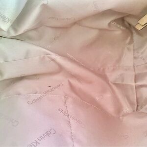 Chic Calvin Klein Angelina bag very soft pebble leather crossbody in beige/tan textile interior. A color that can take you through Fall. Sleek design with a modern touch. Ideal for daily use. Very versatile can use drop handle, or drop handle as shorter shoulder bag or crossbody strap 21” Gently used a few times but a few ink marks inside, lots of storage area large inside zip compartment, other compartments too. Slight indentation in the back see on video. Otherwise hardware handles are all in great shape. Top zip so easy to use very spacious. With Dust protector too.