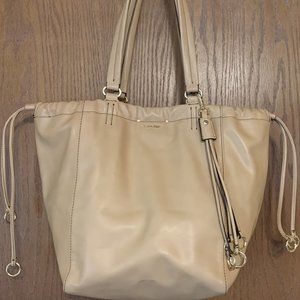 Large tote bag with magnetic and drawstring like closure on main opening; inside has two cell phone pockets and one zipper pocket; outside has one magnetic closure pocket. Neutral beige / tan color with gold-tone accents. Gently used condition, see last image showing small crack on handle. Big enough that I was able to carry my laptop along with my usual handbag contents. Vegan materials.