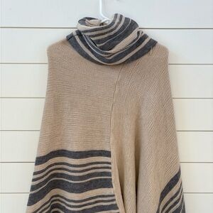 Stylish poncho with beige and charcoal stripes. Perfect for layering.