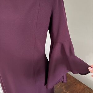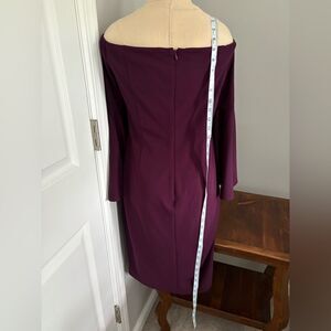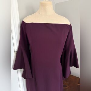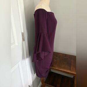 Excellent condition, Calvin Klein Bell Sleeve Off Shoulder Cocktail Dress Evening Wedding Size 12. Color Plum - dress has one zipper in the back, is fully lined. The two front and back seams in the dress have wire in them for good shape and support, and the top of the dress has nonslip rubber along the seam. 94% polyester and 6% spandex – dry clean only. See pictures for length and armpit to armpit measurements.