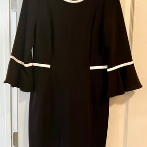 This chic black sheath dress features a flattering tailored silhouette with feminine bell sleeves accented by crisp white trim. The structured fit creates a polished, sophisticated look perfect for professional settings, evening events, or special occasions.
