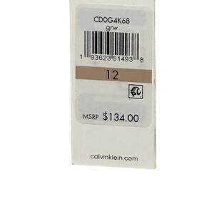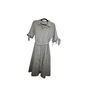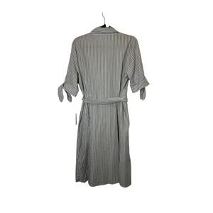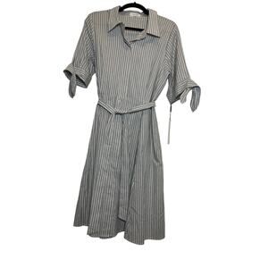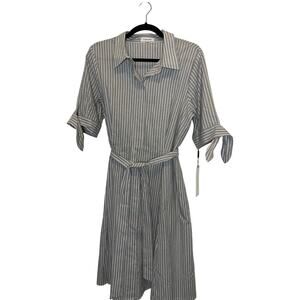 Calvin Klein belted t-shirt dress (New with Tags) women's size 12. Light gray with vertical white stripes. Original MSRP: $134. No flaws. Belt included. Tie-detail sleeves. Crisp, structured fabric.