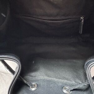 Chic black backpack with drawstring closure. Features silver-tone hardware and front zip pocket. Ideal for everyday use. The drawstring is a bit damaged(see pictures) but the backpack itself is in perfect condition.