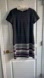 This is an easy-to-wear, classic fit, knee length dress by Calvin Klein. It’s black with purple an white stripes on the bottom. It’s a short sleeve, crewneck with a gold zipper up the back. It is in very good, preowned condition and from a smoke free home. No flaws observed.