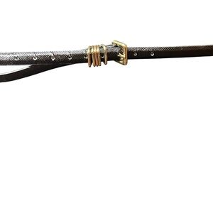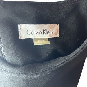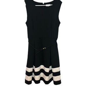 Calvin Klein swing dress. Sleeveless with black and white stripe at the bottom. Back zipper. Skinny belt with gold details. Polyester, rayon, spandex blend. Excellent preowned condition. Classy and elegant!