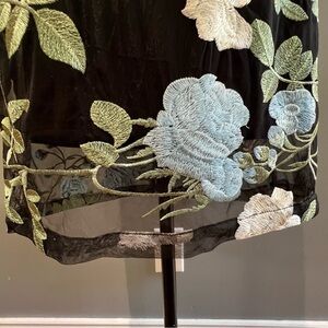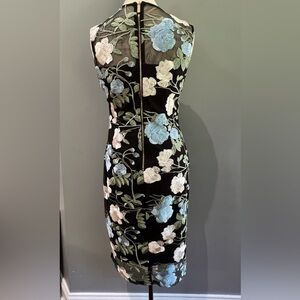 Elegant black midi dress with floral design. Features blue and white flowers. Perfect for any occasion.