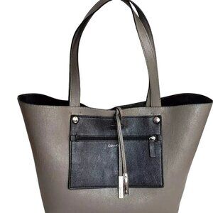 Calvin Klein Black Gray Reversible Leather Tote Bag Magnetic Closure Logo