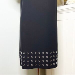 Calvin Klein Black T Shirt Shift Dress with Grommets. Unique style that’s comfortable all day! Lined with a zipper in back. Silver grommets on the hem and sleeves. Like new. Size 8.
