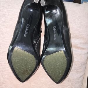 Experience timeless elegance with these Calvin Klein black heels, crafted from smooth leather for a sophisticated look. The pointed-toe design and sleek silhouette make them perfect for professional settings or upscale events. Enjoy the comfort and style that these well-crafted shoes bring to any occasion.