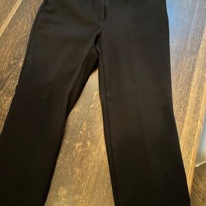 Knit black straight leg pants, great for dressier occasions, perfect for work. material is a great weight to fall nicely. Material is great year round. Wore with white button up shirt and long pearls for evening out or a sweater for a more casual look. Versatile piece and wardrobe staple. Front and rear pockets.