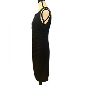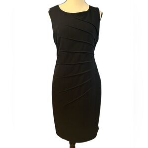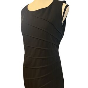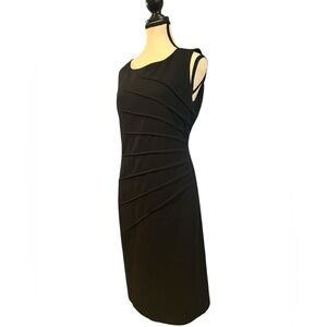 Chic black midi dress with a sleeveless design. Features elegant pleats for a modern look. Perfect for any occasion.