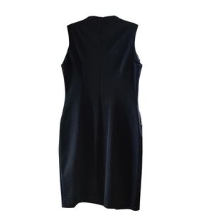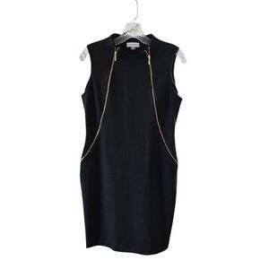 Elegant black midi dress featuring gold zipper accents. Sleeveless and chic. Perfect for versatile styling.