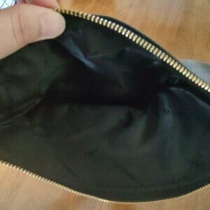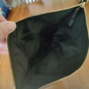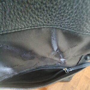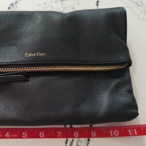 Calvin Klein Black Pebble Leather Fold Over Purse. 11 inches × 7 inches. Gold zipper. Crossbody strap is missing.