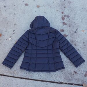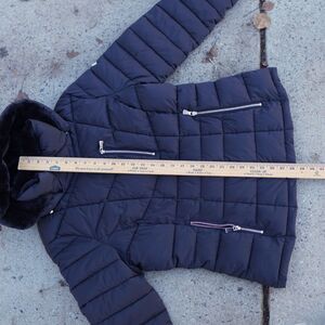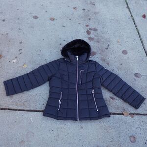 Stay warm and stylish all winter long in this classic puffer coat from Calvin Klein! This coat is described as being in great shape and looking brand new, and features a removable hood with faux fur trim, and a cozy faux fur lining inside the stand collar.