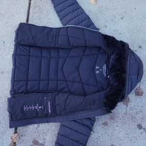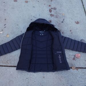 Calvin Klein Black Puffer Coat Women's L Faux Fur Hood Water Resistant