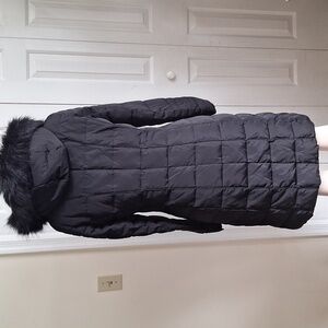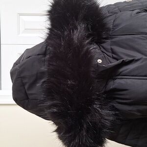 Chic black puffer coat by Calvin Klein. Features a cozy faux fur hood. Ideal for cold weather.