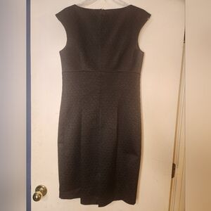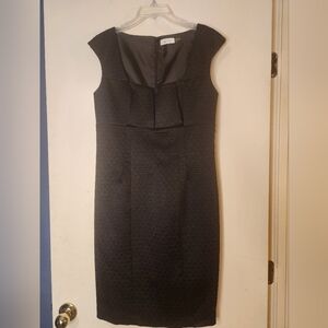This Calvin Klein dress is a sophisticated sheath style in a classic black hue, perfect for cocktail events or work settings. The sleeveless design features a scoop neckline, offering a sleek and modern look. Crafted with clean lines and a structured fit, this midi dress embodies timeless elegance and versatility. length 38 inches. pit to pit is 16 inches