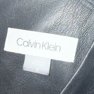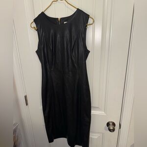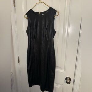 This elegant black sheath dress by Calvin Klein is designed for a night out, featuring a sleeveless cut and a classic crew neckline. Its fitted silhouette and midi length create a chic and sophisticated look, perfect for cocktail events. The dress's minimalist style ensures it remains a timeless wardrobe staple.