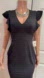 This elegant black mini dress by Calvin Klein features a flattering V-neckline and stylish flutter cap sleeves. Its sheath silhouette is perfect for cocktail parties or a night out, offering a chic and sophisticated look.
