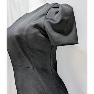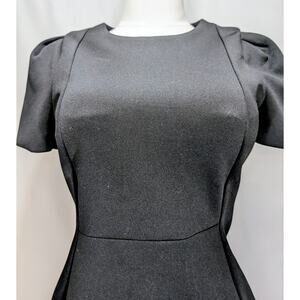 Calvin Klein black sheath dress with short puff sleeves and gold back zipper. Structured fit with light stretch for comfort. Knee to below-knee length, depending on height.