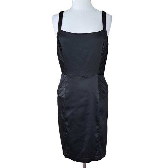 This elegant Calvin Klein Black Satin Sheath Dress features flattering paneled sides and a square neckline, elevating this Little Black Dress, perfect for your special event.
