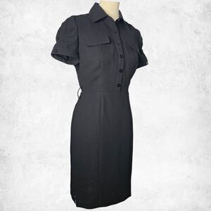 This Calvin Klein black utility-style shirt dress serves dark-feminine authority with clean tailoring and a no-stretch structure that commands attention. The crisp collared neckline, puff sleeves with button cuffs, and hidden side-zip closure give it that perfect mix of vintage discipline and modern rebellion.