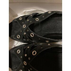Calvin Klein Devora sandals in black suede feature a slip-on design with an open toe, a platform heel for added height, stylish grommet embellishments, and a durable rubber sole. Size 6.5M US, brand new in box. The item pictured is exactly what you will receive.
