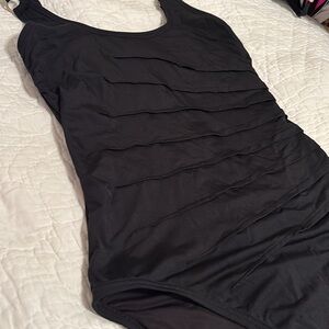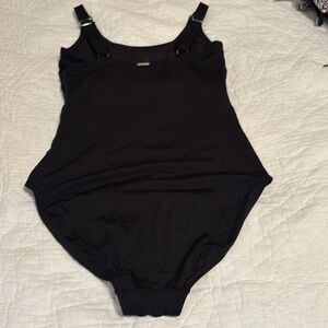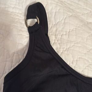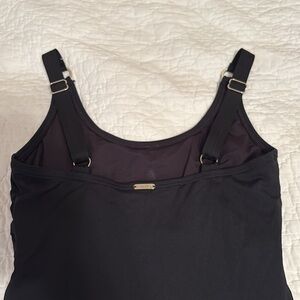Chic black swimwear featuring a gold Calvin Klein logo. Sleek and modern design.