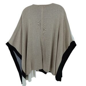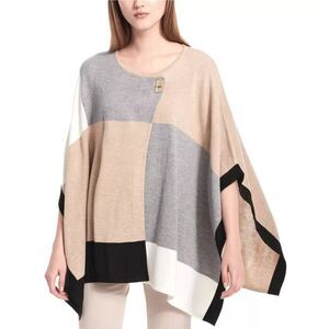 Calvin Klein poncho sweater in a chic black and tan colorblock with gold accents offers a versatile, relaxed fit for year-round elegance.