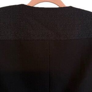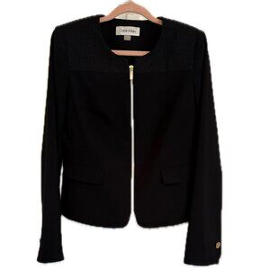 Classic and sophisticated Calvin Klein black zip-front jacket featuring textured woven panels at the shoulders, faux front pockets and gold hardware. Fully lined with a sleek, tailored fit — perfect for work or evening wear. Size 8 Petite.