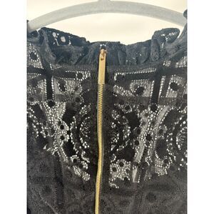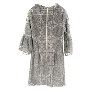 Details: Semi-sheer lace, bell sleeves, ruffle neckline, back zip closure