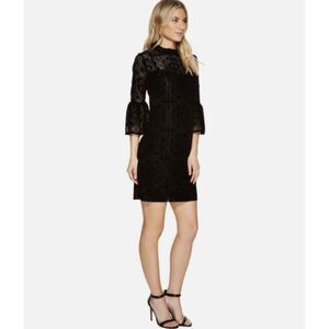 Elegant and timeless, this Calvin Klein women’s dress in size 10 blends velvet and lace for a sophisticated look. The dress features a semi-sheer lace overlay with a velvet texture, bell sleeves, and a flattering silhouette — perfect for cocktail parties, formal gatherings, or evening events.