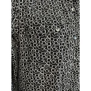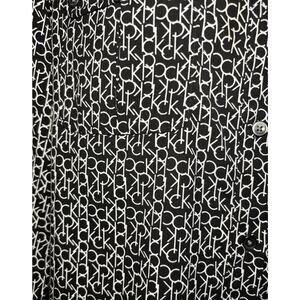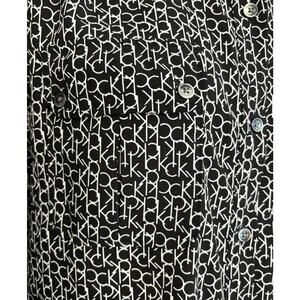 Elevate your wardrobe with this chic Calvin Klein black and white button-up blouse. Featuring the iconic CK logo pattern, this long-sleeved top is a must-have for any fashion-forward woman. The collared neckline and fitted sleeves add a touch of sophistication, making it perfect for both casual and business occasions.