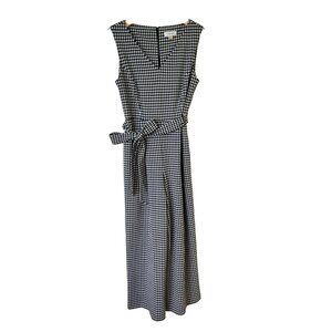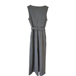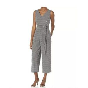 Sleeveless houndstooth, gingham jumpsuit by Calvin Klein with a detachable matching waist tie and cropped leg length. Size 6.