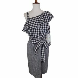 Calvin Klein Black White Gingham One Shoulder Ruffle Tie Waist Midi Dress 4 NWT