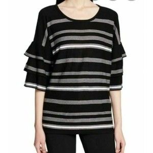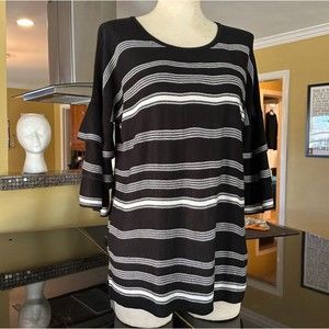 Calvin Klein Black & White Stripe Ruffled Bell Sleeve Scoop Neck Tunic Sweater