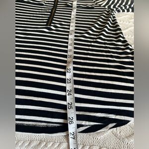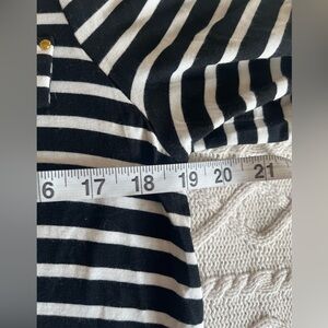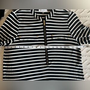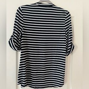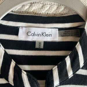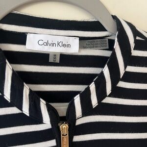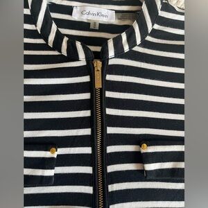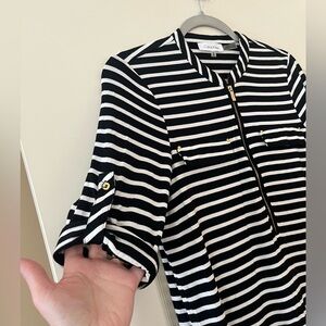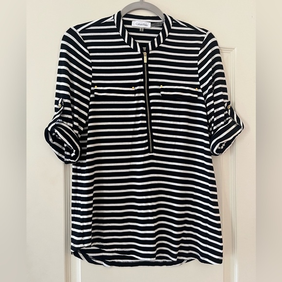 EUC excellent condition! Beautiful rich black & white horizontal stripes blouse by Calvin Klein. Rayon & polyester blend. Faux front pockets. Gold buttons for added detail. Front zipper. 3/4 sleeve, roll up with gold buttons. Collar. Sophisticated style. Women’s size medium. Smoke free home
