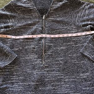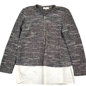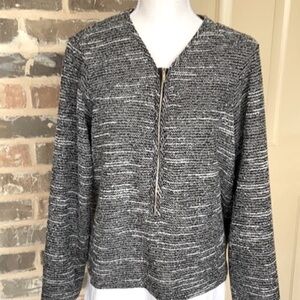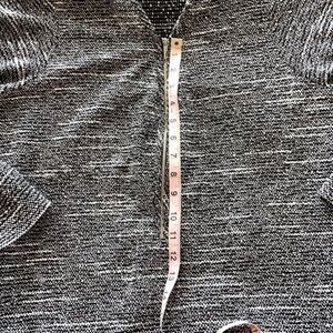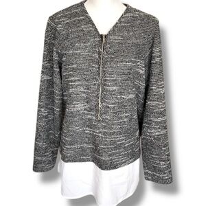 Gray Black White Heathered Fabric with Silver Zipper accents. 0X size which is like a XL. Lightweight sleeve with white layered hem. Very polished. Stretchy lightweight fabric. Approximate measurements in photos. Excellent condition. No known flaws.