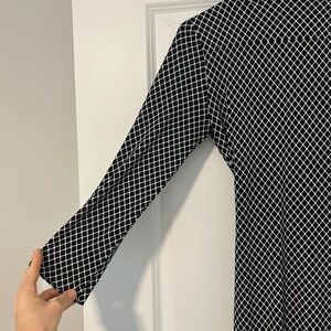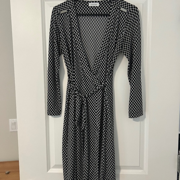 Classic Calvin Klein wrap dress in a black and white geometric print. Flattering V-neck, tie waist, and long sleeves. Great for work, events, or travel. Lightweight, comfortable fabric with a polished look.