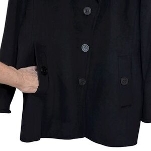 Classic black wool blend coat from Calvin Klein, tailored with a notched lapel collar, three-button front, and flap pockets. Fully lined with satin finish interior and a center back vent for ease of movement. A timeless, versatile piece that combines warmth and sophistication—perfect for fall and winter layering.