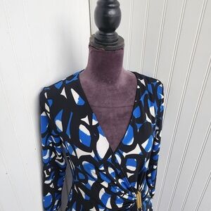 Calvin Klein Wrap Dress Geometric Print Blue Black Stretch 3/4 Sleeve Sz S