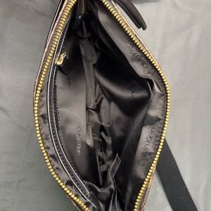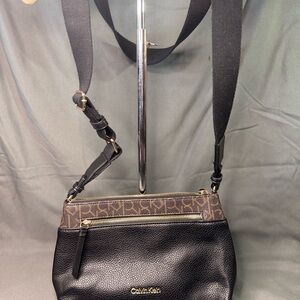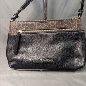 Chic Calvin Klein shoulder bag. Features black and brown design. Perfect for versatile styling.