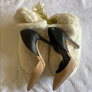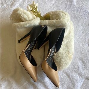 Elegant Calvin Klein heels. Sleek black and tan design. Perfect for any occasion.