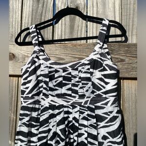 Stylish dress with a striking black and white zebra pattern. A rounded front neckline and a tasteful v shape on the back.There is no size tag , but it is consistent with a Calvin Klein size large. Measurements are 16” waist across laying flat, 17” bust, and the length is 48”.