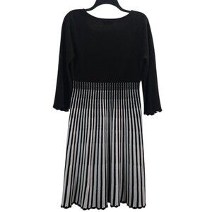 This Calvin Klein dress has long sleeves, a scoop neck, and pretty detailed edges along the bottom hem and the cuffs. The upper half is black and the lower half has a striking black and white striped pattern. The dress is in very good used condition with minor signs of wear. No stains or blemishes. It is size medium.