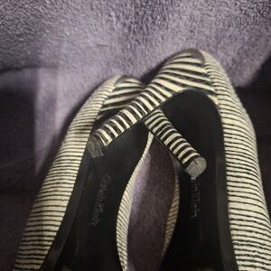 Step out in style with these chic Calvin Klein heels. Featuring a striking black and white striped design, these shoes are perfect for any occasion. Elevate your wardrobe with this elegant pair.
