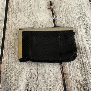 Calvin Klein. Black faux snakeskin. Silver hardware. Some scratches on the silver part. Good used condition. Inside is clean. See photo for size.