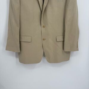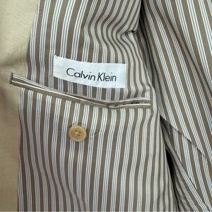 Calvin Klein Blazer Mens Size 44L Tan Beige 2 Button Sport Jacket 100% Linen. Striped polyester lining. Collar and lapels. 2 front flap pockets and one breast pocket. 3 interior pockets. Chest 46. Waist 42. Sleeve from seam 24. Back seam to seam 19. Measurements are approximate. Double back vent. 4 button cuff. Very good preowned condition.